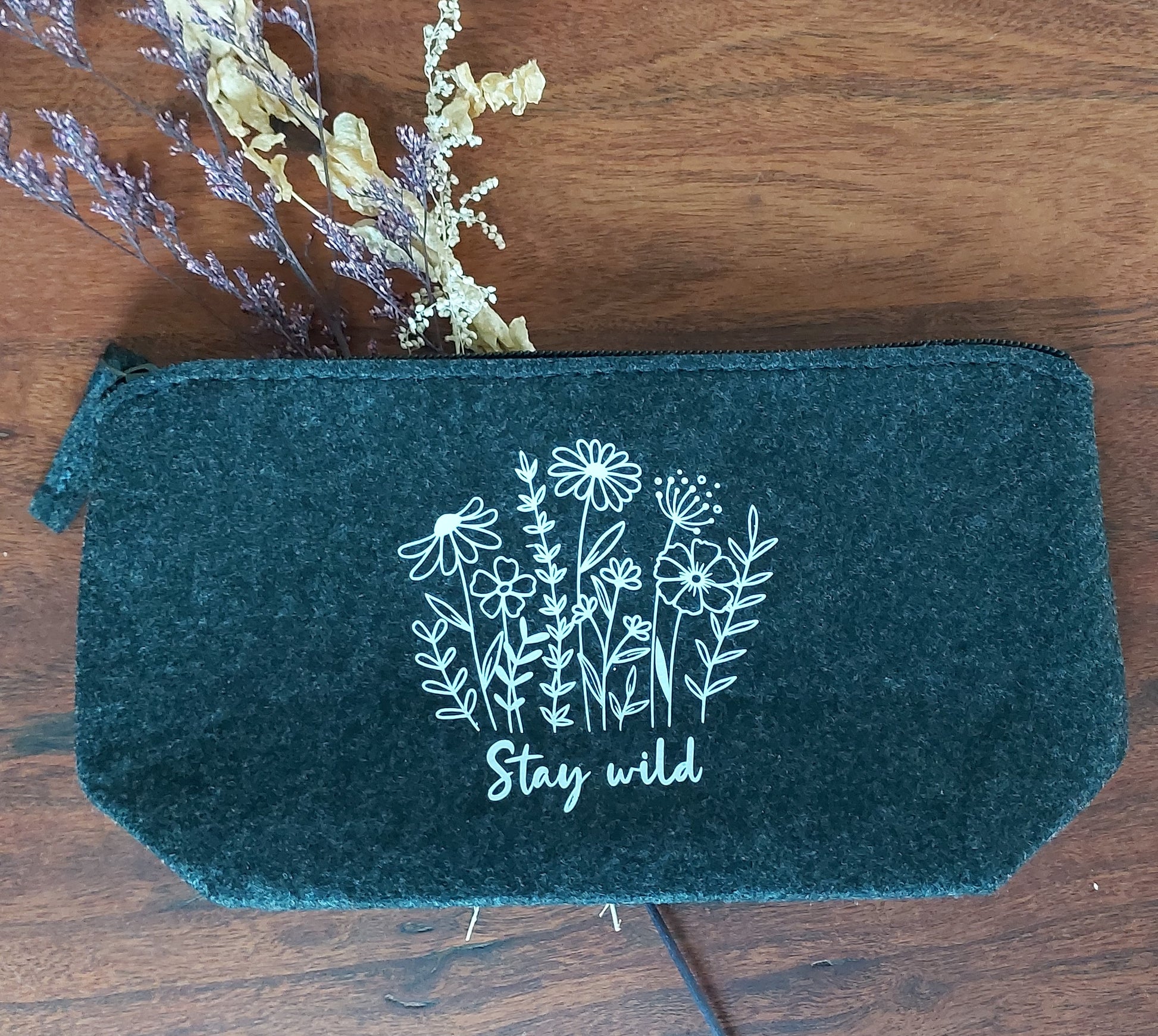 Unsere Kosmetiktasche aus Filz mit Blumenmotiv und dem inspirierenden Spruch "stay wild" ist perfekt, um deine Schönheitsprodukte stilvoll zu verstauen! Das wunderschöne Blumenmotiv verleiht der Tasche einen femininen und natürlichen Touch, während der Spruch "stay wild" dich daran erinnert, immer du selbst zu sein und deine wilde Seite zu zeigen. 🌸🌿💄